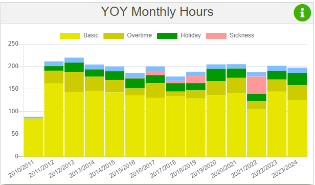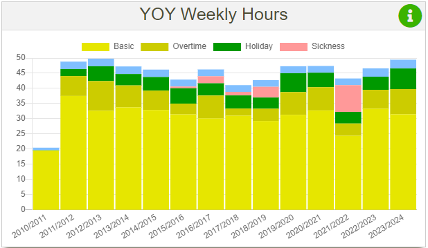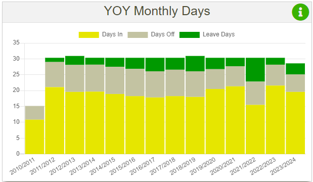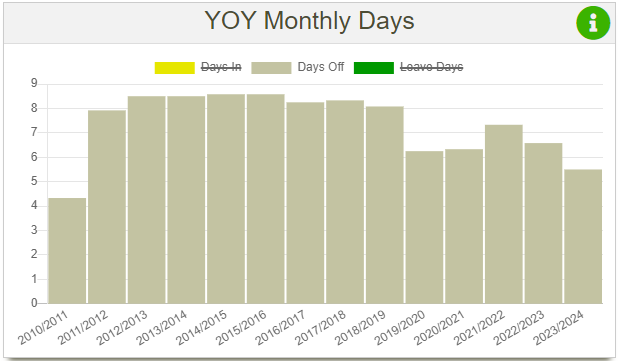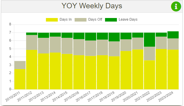 This chart displays similar data to YOY monthly days, but I still decided to create as I wanted to have this data. It also displays 3 types of days: days in, days off and leave days. The averages are calculated by getting the sum of days and then dividing it by either 52 or 53, depending on how many weeks are in the tax year (this value in my code is stored in a variable named $taxPeriodQuantityFull).