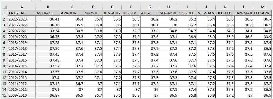 However the data on this site is provided for 3 months averages, so I had to create an excel file and calculate averages from April to April, to match each tax year.