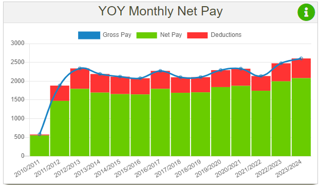 As the name suggests this chart displays monthly net pay, gross pay and deductions for the chosen period of time. It is calculated by dividing each years net, gross pay and deductions by 12.