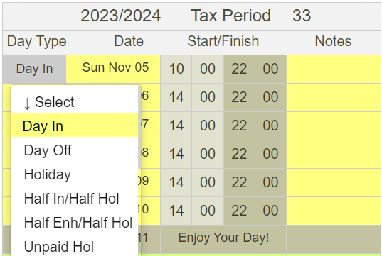 Once payments and deductions are set, start and finish times have to be provided using the table demonstrated in the picture below.