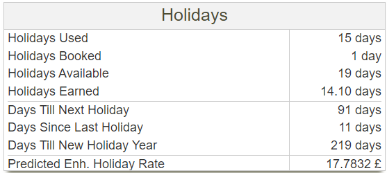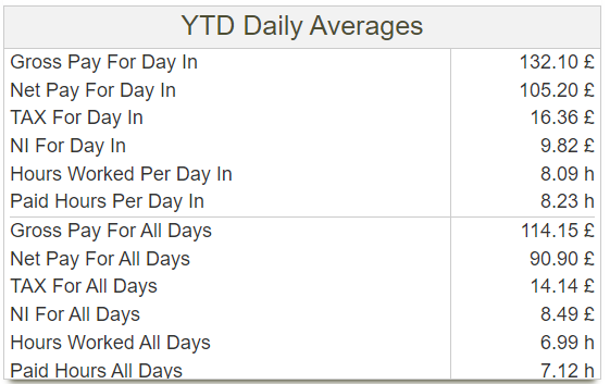 Flickerbook also enabled me to compare my earning to other jobs, which otherwise would be difficult. For example my brother in law was working in constructions, and he would be paid for a day’s work, which was significantly more then what I was earning in the warehouse, but he would not get paid for annual leave or overtimes, and his income would also be dependant on projects, which occasionally can leave you without any income. By gathering data for how many days I have worked and how much I got paid, I’m able to determine how much I earn per working day. For example today (16/08/2023) my “Gross Pay For Day In” is 149.88 £ for this ongoing tax year.