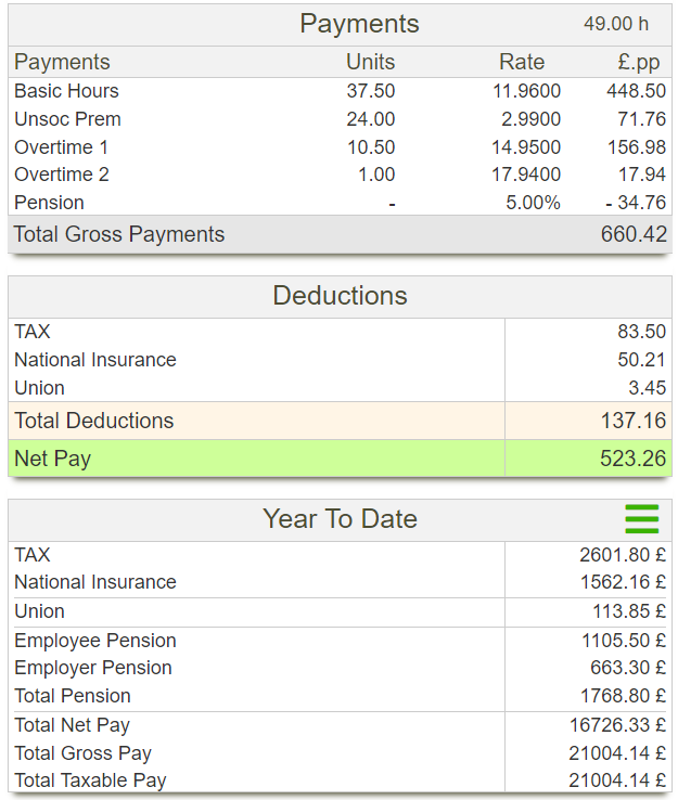 Once the payments, deductions and working hours are provided a payslip can be generated using all the information. An example of one weeks payslip is demonstrated below: