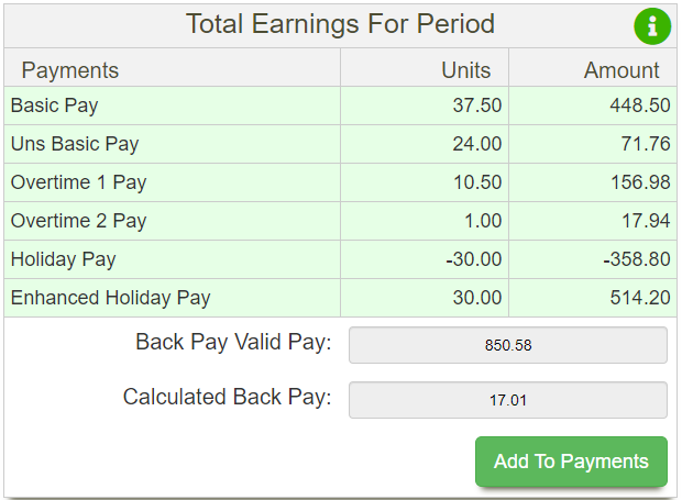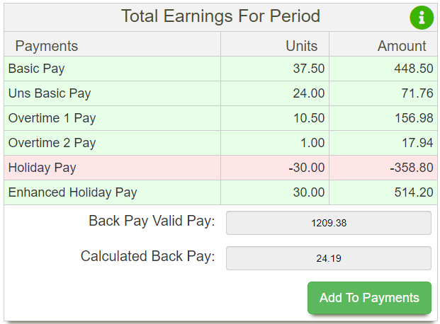 - Once the payments had been retrieved and loaded into the results table, a user could then select which payments to include into back pay calculation by marking a checkbox. Once this was done a back pay could have been calculated.
